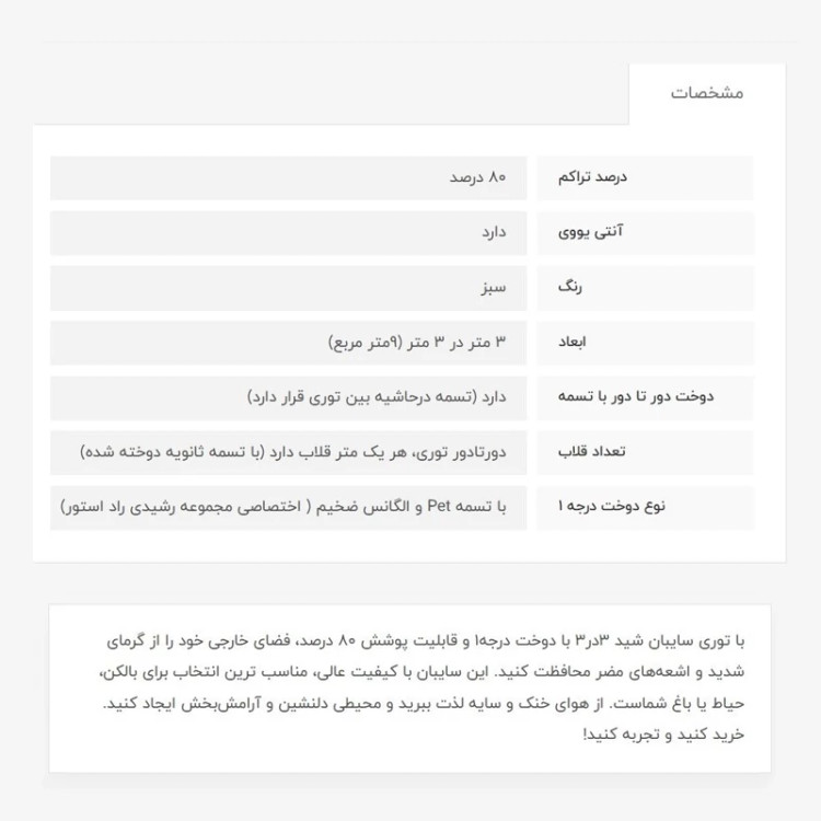 توری سایبان شید، 3در3، دوخت درجه 1، 80درصد
