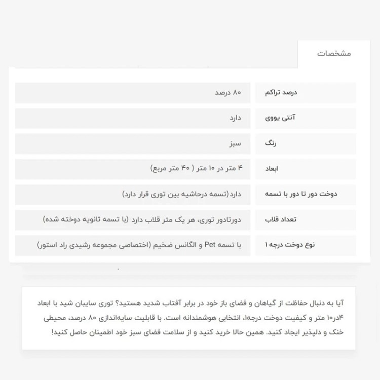 توری سایبان شید، 4در10، دوخت درجه1، 80درصد