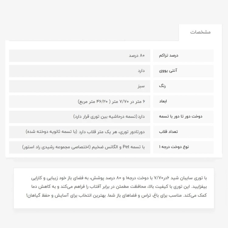 توری سایبان شید،6در7.70،دوخت درجه1، 80درصد
