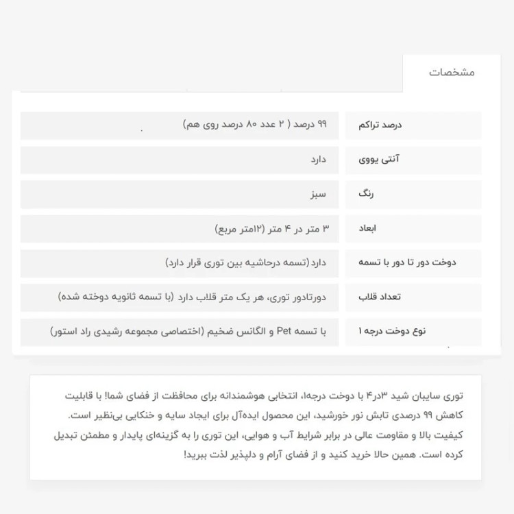 توری سایبان شید، 3در4، 99 درصدپلاس