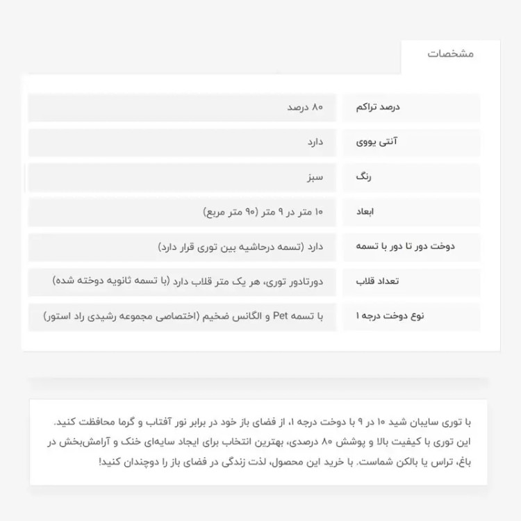 توری سایبان شید، 80 درصد، انتی یووی دار بوده که از اشعه خطرناک خورشید جلوگیری میکند و دربرابر آفتاب مقاومت بالایی دارد. دوخت درجه 1 (منظور تسمه و دوخت بسیار قویتر میباشد)، یک تسمه محکم دورتادور توری، و هر متر یک قلاب با تسمه ثانویه دوخت خورده است. توری سایبان شید، برخلاف برزنت، وزن سبکی دارد و هوا را خف نمیکند، یعنی هوا در جریان هست. همچنین ارزان تر و با دوام تر میباشد. این ابعاد به خاطر بسته بندی بزرگ، هزینه پستی بیشتری دارد، درصورت تمایل ارسال با باربری، پیام بدهید